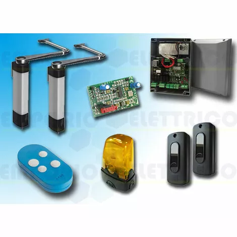 CAME – KIT D’AUTOMATION STYLO 8K01MB-015, TESTÉ SELON LES NORMES EN 12453-EN 12445SYSTÈME COMPLET POUR PORTAILS BATTANTS JUSQU’À 1,8 M PAR VANTAIL AVEC MOTEUR 24V DCPOIDS MAXIMAL DU VANTAIL 100 KGKIT STYLO8K01MB-01524V DC IL INCLUT :- 2 STYLO-ME Motoréducteurs irréversibles avec encodeur pour vantaux jusqu’à 1,8 m, 24V DC- 2 STYLO-BS Bras de transmission articulé- 1 801QA-0050 Armoire de commande multifonctionnelle, avec affichage de programmation et de signalisation, autodiagnostic des dispositifs de sécurité, Adaptive Speed & Torque Technology, BUS CXN, 2 entrées de sécurité et stockage pour un maximum de 250 utilisateurs.- 1 AF43S Carte radiofréquence enfichable 433,92 MHz- 1 806TS-0121 TOPD4RBS Émetteur bi-fréquence à quatre canaux avec fonction d’auto-apprentissage, couleur bleue. (16.777.216 dans le mode TAM, 4.096 combinaisons dans le mode TOP).- 1 DIR10 Paire de photocellules infrarouges pour montage en surface avec une portée de 10 Mt- 1 KLED24 clignotant à LED 24V DC- 1 Plaque de porte