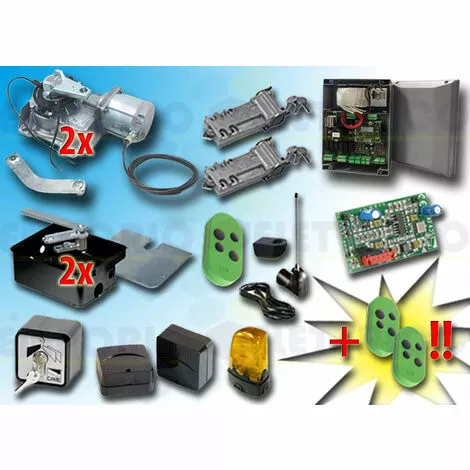 CAME – KIT DE MOTORISATION 24V DC POUR PORTAILS BATTANTS JUSQU’À 3,5 MT PAR VANTAIL, AUTOMATISME ENTERRÉ  001FROG-A24 type 2E  24V DCLE KIT COMPREND:- 2 FROG-A24 MOTEURS 24V DC BLOQUANTS-  2 FROG-CFN  CAISSONS DE FONDATION EN ACIER- 2 A4366 DISPOSITIFS DE DÉBLOCAGE AVEC CLÉ PERSONNALISÉE- 1 801QA-0050 ARMOIRE DE COMMANDE (ex ZL19N)-  1 AF43S RÉCEPTEUR RADIO EN 433,92 MHz- 3 806TS-0104 TÉLÉCOMANDE 4 CANAUX EN 433.92/868.35 MHz CODE FIXE, DOUBLE FRÉQUENCE, 4 BOUTONS, VERT. TOPD4FES  – 1 TOP-A433N  ANTENNE EN 433,92 MHZ- 1 TOP-RG58 CÂBLE COAXIAL 5 MT-  1 SET-E SÉLECTEUR À CLÉ- 1  806TF-0080 PAIRE DE PHOTOCELLULES INFRAROUGES RÉGLABLES ET SYNCHRONISÉES POUR L’EXTÉRIEUR, PORTÉE DE 30 MÈTRES.(EX CODE 001DELTA-SE / 001DELTA-E)- 1 KLED24 CLIGNOTANT À LED 24V DC- 1 KIAROS SUPPORT CLIGNOTANT- 1 PLAQUE PORTAIL