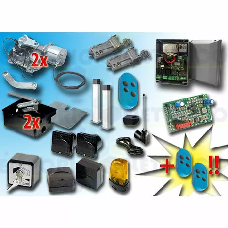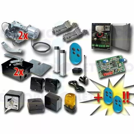 CAME – KIT DE MOTORISATION 24V DC POUR PORTAILS BATTANTS JUSQU’À 3,5 MT PAR VANTAIL, AUTOMATISME ENTERRÉ 001FROG-A24 type 3B 24V DCLE KIT COMPREND:- 2 FROG-A24 MOTEURS 24V DC BLOQUANTS- 2 FROG-CFN CAISSONS DE FONDATION EN ACIER- 2 A4366 DISPOSITIFS DE DÉBLOCAGE AVEC CLÉ PERSONNALISÉE- 1 801QA-0050 ARMOIRE DE COMMANDE (ex ZL19N)- 1 AF43S RÉCEPTEUR RADIO EN 433,92 MHz- 3 806TS-0101 TÉLÉCOMANDE 4 CANAUX EN 433.92/868.35 MHz CODE FIXE, DOUBLE FRÉQUENCE, 4 BOUTONS, BLAU. TOPD4FBS- 1 TOP-A433N ANTENNE EN 433,92 MHZ- 1 TOP-RG58 CÂBLE COAXIAL 5 MT- 1 806TF-0070 PAIRE DE PHOTOCELLULES RÉGLABLES À RAYONS INFRAROUGES SYNCHRONISÉS À ENCASTRER. PORTÉE : 30 MÈTRES (EX CODE 001DELTA-SI / 001DELTA-I)- 2 DOC-L COLONNETTE EN ALUMINIUM H=0,5 MT- 1 SET-E CONTACTEUR À CLÉ- 1 806TF-0080 PAIRE DE PHOTOCELLULES INFRAROUGES RÉGLABLES ET SYNCHRONISÉES POUR L’EXTÉRIEUR, PORTÉE DE 30 MÈTRES.(EX CODE 001DELTA-SE / 001DELTA-E)- 1 KLED24 CLIGNOTANT À LED 24V DC- 1 KIAROS SUPPORT CLIGNOTANT- 1 PLAQUE PORTAIL