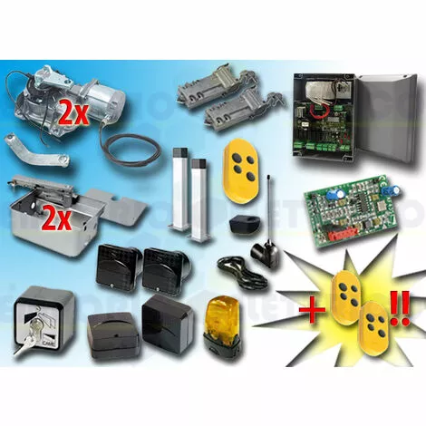 CAME – KIT DE MOTORISATION 24V DC POUR PORTAILS BATTANTS JUSQU’À 3,5 MT PAR VANTAIL, AUTOMATISME ENTERRÉ  001FROG-A24 type 4D  24V DCLE KIT COMPREND:- 2 FROG-A24 MOTEURS 24V DC BLOQUANTS-  2 FROG-CFNI  CAISSONS DE FONDATION EN INOX AISI 304- 2 A4366 DISPOSITIFS DE DÉBLOCAGE AVEC CLÉ PERSONNALISÉE- 1 801QA-0050 ARMOIRE DE COMMANDE (ex ZL19N)-  1 AF43S RÉCEPTEUR RADIO EN 433,92 MHz- 3 806TS-0103 TÉLÉCOMANDE 4 CANAUX EN 433.92/868.35 MHz CODE FIXE, DOUBLE FRÉQUENCE, 4 BOUTONS, JAUNE. TOPD4FYS  – 1 TOP-A433N  ANTENNE EN 433,92 MHZ- 1 TOP-RG58 CÂBLE COAXIAL 5 MT- 1 806TF-0070 PAIRE DE PHOTOCELLULES RÉGLABLES À RAYONS INFRAROUGES SYNCHRONISÉS À ENCASTRER. PORTÉE : 30 MÈTRES (EX CODE 001DELTA-SI / 001DELTA-I)-  2  DOC-L  COLONNETTE EN ALUMINIUM H=0,5 MT-  1 SET-E CONTACTEUR À CLÉ- 1  806TF-0080 PAIRE DE PHOTOCELLULES INFRAROUGES RÉGLABLES ET SYNCHRONISÉES POUR L’EXTÉRIEUR, PORTÉE DE 30 MÈTRES.(EX CODE 001DELTA-SE / 001DELTA-E)- 1 KLED24 CLIGNOTANT À LED 24V DC- 1 KIAROS SUPPORT CLIGNOTANT​- 1 PLAQUE PORTAIL