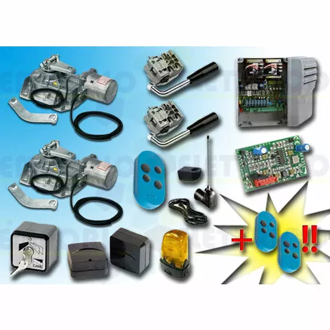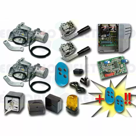 CAME – KIT DE MOTORISATION 24V DC POUR PORTAILS BATTANTS JUSQU’À 3,5 MT PAR VANTAIL, AUTOMATISME ENTERRÉ, AVEC ENCODEURCAISSON DE FONDATION PAS COMPRIS 001FROG-A24E type 1B 24V DCLE KIT COMPREND:- 2 FROG-A24E MOTEURS 24V DC BLOQUANTS AVEC ENCODEUR- 2 A4364 DISPOSITIFS DE DÉBLOCAGE AVEC CLÉ À LEVIER- 1 801QA-0050 ARMOIRE DE COMMANDE (ex ZL19N)- 1 AF43S RÉCEPTEUR RADIO EN 433,92 MHz- 3 806TS-0101 TÉLÉCOMANDE 4 CANAUX EN 433.92/868.35 MHz CODE FIXE, DOUBLE FRÉQUENCE, 4 BOUTONS, BLEU. TOPD4FBS – 1 TOP-A433N ANTENNE EN 433,92 MHZ- 1 TOP-RG58 CÂBLE COAXIAL 5 MT- 1 SET-E SÉLECTEUR À CLÉ- 1 806TF-0080 Paire de photocellules infrarouges réglables et synchronisées pour l’extérieur, portée de 30 mètres (ex code 001delta-se / 001delta-e)- 1 KLED24 CLIGNOTANT À LED 24V DC- 1 KIAROS SUPPORT CLIGNOTANT- 1 PLAQUE PORTAILCAISSON DE FONDATION PAS COMPRIS