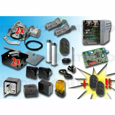 CAME – KIT DE MOTORISATION 24V DC POUR PORTAILS BATTANTS JUSQU’À 3,5 MT PAR VANTAIL, AUTOMATISME ENTERRÉ, AVEC ENCODEUR 001FROG-A24E type 3C 24V DCLE KIT COMPREND:- 2 FROG-A24E MOTEURS 24V DC BLOQUANTS AVEC ENCODEUR- 2 FROG-CFN CAISSONS DE FONDATION EN ACIER- 2 A4366 DISPOSITIFS DE DÉBLOCAGE AVEC CLÉ PERSONNALISÉE- 1 801QA-0050 ARMOIRE DE COMMANDE (ex ZL19N)- 1 AF43S RÉCEPTEUR RADIO EN 433,92 MHz- 3 806TS-0102 TÉLÉCOMANDE 4 CANAUX EN 433.92/868.35 MHz CODE FIXE, DOUBLE FRÉQUENCE, 4 BOUTONS, NOIR. TOPD4FKS- 1 TOP-A433N ANTENNE EN 433,92 MHZ- 1 TOP-RG58 CÂBLE COAXIAL 5 MT- 1 806TF-0070 Paire de photocellules réglables à rayons infrarouges synchronisés à encastrer. portée : 30 mètres (ex code 001delta-si / 001delta-i)- 2 DOC-L COLONNETTE EN ALUMINIUM H=0,5 MT- 1 SET-E SÉLECTEUR À CLÉ- 1 806TF-0080 Paire de photocellules infrarouges réglables et synchronisées pour l’extérieur, portée de 30 mètres (ex code 001delta-se / 001delta-e)- 1 KLED24 CLIGNOTANT À LED 24V DC- 1 KIAROS SUPPORT CLIGNOTANT- 1 PLAQUE PORTAIL