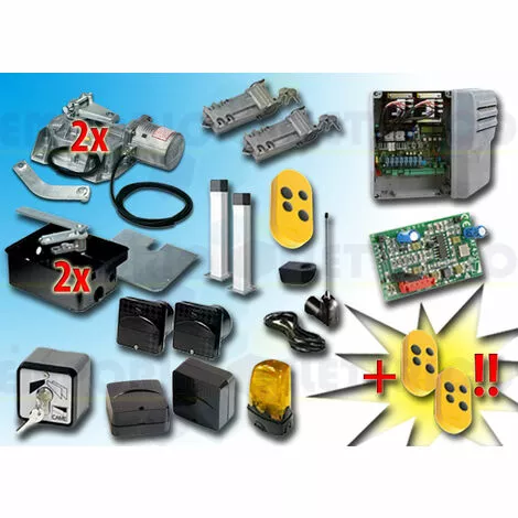 CAME – KIT DE MOTORISATION 24V DC POUR PORTAILS BATTANTS JUSQU’À 3,5 MT PAR VANTAIL, AUTOMATISME ENTERRÉ, AVEC ENCODEUR 001FROG-A24E type 3D 24V DCLE KIT COMPREND:- 2 FROG-A24E MOTEURS 24V DC BLOQUANTS AVEC ENCODEUR- 2 FROG-CFN CAISSONS DE FONDATION EN ACIER- 2 A4366 DISPOSITIFS DE DÉBLOCAGE AVEC CLÉ PERSONNALISÉE- 1 801QA-0050 ARMOIRE DE COMMANDE (ex ZL19N)- 1 AF43S RÉCEPTEUR RADIO EN 433,92 MHz- 3 806TS-0103 TÉLÉCOMANDE 4 CANAUX EN 433.92/868.35 MHz CODE FIXE, DOUBLE FRÉQUENCE, 4 BOUTONS, JAUNE. TOPD4FYS- 1 TOP-A433N ANTENNE EN 433,92 MHZ- 1 TOP-RG58 CÂBLE COAXIAL 5 MT- 1 806TF-0070 Paire de photocellules réglables à rayons infrarouges synchronisés à encastrer. portée : 30 mètres (ex code 001delta-si / 001delta-i)- 2 DOC-L COLONNETTE EN ALUMINIUM H=0,5 MT- 1 SET-E SÉLECTEUR À CLÉ- 1 806TF-0080 Paire de photocellules infrarouges réglables et synchronisées pour l’extérieur, portée de 30 mètres (ex code 001delta-se / 001delta-e)- 1 KLED24 CLIGNOTANT À LED 24V DC- 1 KIAROS SUPPORT CLIGNOTANT- 1 PLAQUE PORTAIL