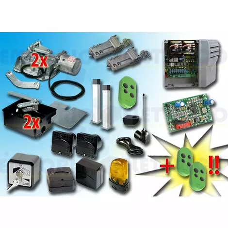 CAME – KIT DE MOTORISATION 24V DC POUR PORTAILS BATTANTS JUSQU’À 3,5 MT PAR VANTAIL, AUTOMATISME ENTERRÉ, AVEC ENCODEUR 001FROG-A24E type 3E 24V DCLE KIT COMPREND:- 2 FROG-A24E MOTEURS 24V DC BLOQUANTS AVEC ENCODEUR- 2 FROG-CFN CAISSONS DE FONDATION EN ACIER- 2 A4366 DISPOSITIFS DE DÉBLOCAGE AVEC CLÉ PERSONNALISÉE- 1 801QA-0050 ARMOIRE DE COMMANDE (ex ZL19N)- 1 AF43S RÉCEPTEUR RADIO EN 433,92 MHz- 3 806TS-0104 TÉLÉCOMANDE 4 CANAUX EN 433.92/868.35 MHz CODE FIXE, DOUBLE FRÉQUENCE, 4 BOUTONS, VERT. TOPD4FES- 1 TOP-A433N ANTENNE EN 433,92 MHZ- 1 TOP-RG58 CÂBLE COAXIAL 5 MT- 1 806TF-0070 Paire de photocellules réglables à rayons infrarouges synchronisés à encastrer. portée : 30 mètres (ex code 001delta-si / 001delta-i)- 2 DOC-L COLONNETTE EN ALUMINIUM H=0,5 MT- 1 SET-E SÉLECTEUR À CLÉ- 1 806TF-0080 Paire de photocellules infrarouges réglables et synchronisées pour l’extérieur, portée de 30 mètres (ex code 001delta-se / 001delta-e)- 1 KLED24 CLIGNOTANT À LED 24V DC- 1 KIAROS SUPPORT CLIGNOTANT- 1 PLAQUE PORTAIL