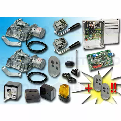 CAME – KIT DE MOTORISATION 230V AC POUR PORTAILS BATTANTS JUSQU’À 3,5 MT PAR VANTAIL, AUTOMATISME ENTERRÉ, AVEC ENCODEURCAISSON DE FONDATION PAS COMPRIS 001FROG-AE type 1A 230V ACLE KIT COMPREND:- 2 FROG-AE MOTEURS 230V AC BLOQUANTS AVEC ENCODEUR- 2 A4364 DISPOSITIFS DE DÉBLOCAGE AVEC CLÉ À LEVIER- 1 ZM3E ARMOIRE DE COMMANDE- 1 AF43S RÉCEPTEUR RADIO EN 433,92 MHz- 3 806TS-0100 TÉLÉCOMANDE 4 CANAUX EN 433.92/868.35 MHz CODE FIXE, DOUBLE FRÉQUENCE, 4 BOUTONS, GRIS. TOPD4FGS- 1 TOP-A433N ANTENNE EN 433,92 MHZ- 1 TOP-RG58 CÂBLE COAXIAL 5 MT- 1 SET-E SÉLECTEUR À CLÉ- 1 806TF-0080 Paire de photocellules infrarouges réglables et synchronisées pour l’extérieur, portée de 30 mètres (ex code 001delta-se / 001delta-e)- 1 KLED CLIGNOTANT À LED 230V AC- 1 KIAROS SUPPORT CLIGNOTANT- 1 PLAQUE PORTAILCAISSON DE FONDATION PAS COMPRIS