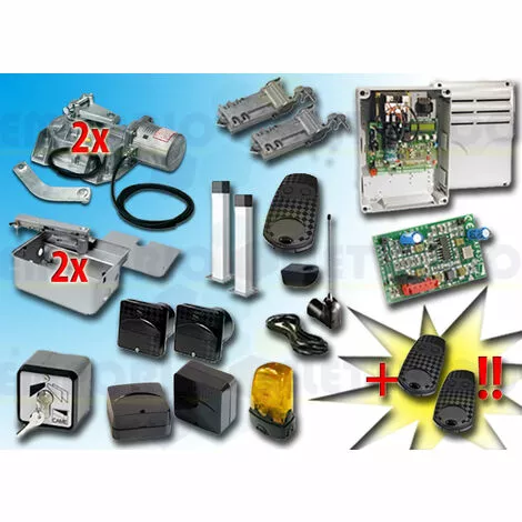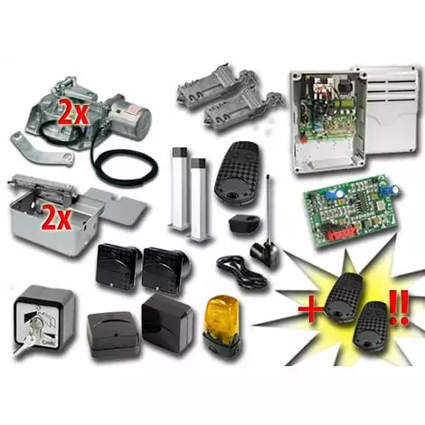 CAME – KIT DE MOTORISATION 230V AC POUR PORTAILS BATTANTS JUSQU’À 3,5 MT PAR VANTAIL, AUTOMATISME ENTERRÉ, AVEC ENCODEUR 001FROG-AE type 4 230V ACLE KIT COMPREND:- 2 FROG-AE MOTEURS 230V AC BLOQUANTS AVEC ENCODEUR- 2 FROG-CFNI CAISSONS DE FONDATION EN INOX AISI 304- 2 A4366 DISPOSITIFS DE DÉBLOCAGE AVEC CLÉ PERSONNALISÉE- 1 ZM3E ARMOIRE DE COMMANDE- 1 AF43S RÉCEPTEUR RADIO EN 433,92 MHz- 3 TOP-432EE TÉLÉCOMMANDE 2 CANAUX EN 433,92 MHz- 1 TOP-A433N ANTENNE EN 433,92 MHZ- 1 TOP-RG58 CÂBLE COAXIAL 5 MT- 1 806TF-0070 Paire de photocellules réglables à rayons infrarouges synchronisés à encastrer. portée : 30 mètres (ex code 001delta-si / 001delta-i)- 2 DOC-L COLONNETTE EN ALUMINIUM H=0,5 MT- 1 SET-E SÉLECTEUR À CLÉ- 1 806TF-0080 Paire de photocellules infrarouges réglables et synchronisées pour l’extérieur, portée de 30 mètres (ex code 001delta-se / 001delta-e)- 1 KLED CLIGNOTANT À LED 230V AC- 1 KIAROS SUPPORT CLIGNOTANT- 1 PLAQUE PORTAIL