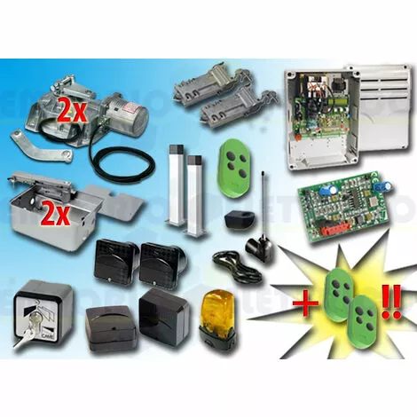 CAME – KIT DE MOTORISATION 230V AC POUR PORTAILS BATTANTS JUSQU’À 3,5 MT PAR VANTAIL, AUTOMATISME ENTERRÉ, AVEC ENCODEUR 001FROG-AE type 4E 230V ACLE KIT COMPREND:- 2 FROG-AE MOTEURS 230V AC BLOQUANTS AVEC ENCODEUR- 2 FROG-CFNI CAISSONS DE FONDATION EN INOX AISI 304- 2 A4366 DISPOSITIFS DE DÉBLOCAGE AVEC CLÉ PERSONNALISÉE- 1 ZM3E ARMOIRE DE COMMANDE- 1 AF43S RÉCEPTEUR RADIO EN 433,92 MHz- 3 806TS-0104 TÉLÉCOMANDE 4 CANAUX EN 433.92/868.35 MHz CODE FIXE, DOUBLE FRÉQUENCE, 4 BOUTONS, VERT. TOPD4FES- 1 TOP-A433N ANTENNE EN 433,92 MHZ- 1 TOP-RG58 CÂBLE COAXIAL 5 MT- 1 806TF-0070 Paire de photocellules réglables à rayons infrarouges synchronisés à encastrer. portée : 30 mètres (ex code 001delta-si / 001delta-i)- 2 DOC-L COLONNETTE EN ALUMINIUM H=0,5 MT- 1 SET-E SÉLECTEUR À CLÉ- 1 806TF-0080 Paire de photocellules infrarouges réglables et synchronisées pour l’extérieur, portée de 30 mètres (ex code 001delta-se / 001delta-e)- 1 KLED CLIGNOTANT À LED 230V AC- 1 KIAROS SUPPORT CLIGNOTANT- 1 PLAQUE PORTAIL