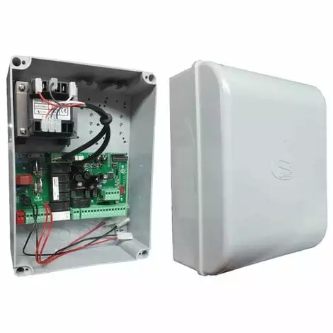 Centrale de commande pour portails battants à deux vantaux, alimentation 230V, avec carte graphique pour la programmation et la signalisation et l’autodiagnostic des dispositifs de sécurité, avec gestion des fins de course et réglage de la vitesse de ralentissement.