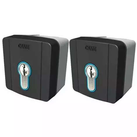 Kit Came composé de 2 pcs. d’interrupteur à clé avec cylindre de fermeture DIN, pour extérieur, rétro-éclairage bleu. Couverture grise RAL7024.