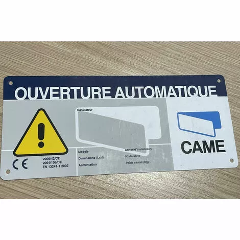 Plaque signaletique d’avertissement “OUVERTURE AUTOMATIQUE” pour portail motorisé 230x100mm plastique 4 perçages CAME